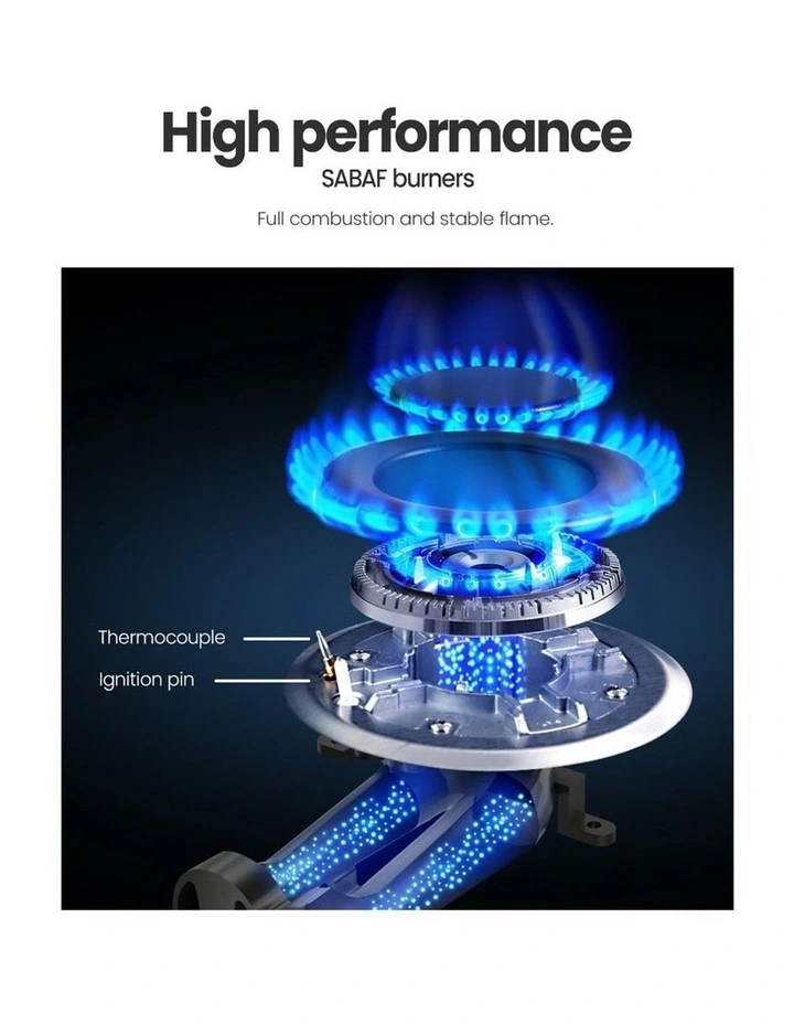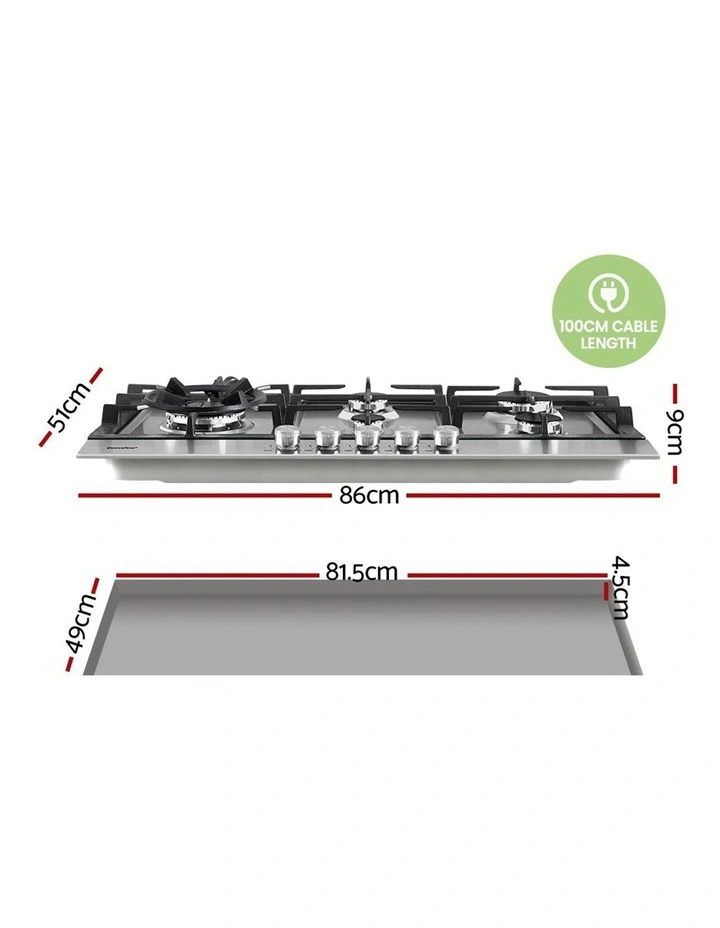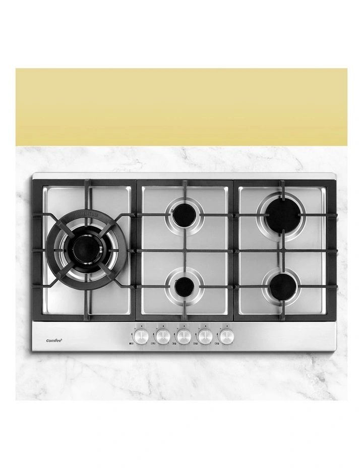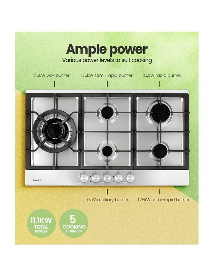 Whether it is for your existing or new home, the Comfee 90cm Gas Cooktop is just the right thing you need for easy, no-fuss cooking. Loaded with an extensive list of chef-friendly features such as an easy ignition system, easy-to-use powder-coated knob controls with safety lock and a flame failure safety device, the cooktop is also incredibly sleek with stainless steel construction. It features five burners including one rapid burner, two semi-rapid burners, one wok burner and one auxiliary burner, all with various power levels to choose from to prepare that perfect dish. The solid cast iron grates hold up your pots and pans perfectly steady and are longlasting and heat-resistant as well. And a pan support is included for use with the auxiliary burner to prevent tiny pans from tipping over and messing up your cooktop. The cooktop is factory set for natural gas but is compatible with LPG once the included LPG conversion kit is installed. Powerful and yet integrally safe, the cooktop promises many moments of hassle-free delicious cooking with the right blend of sophistication and class for your kitchen.