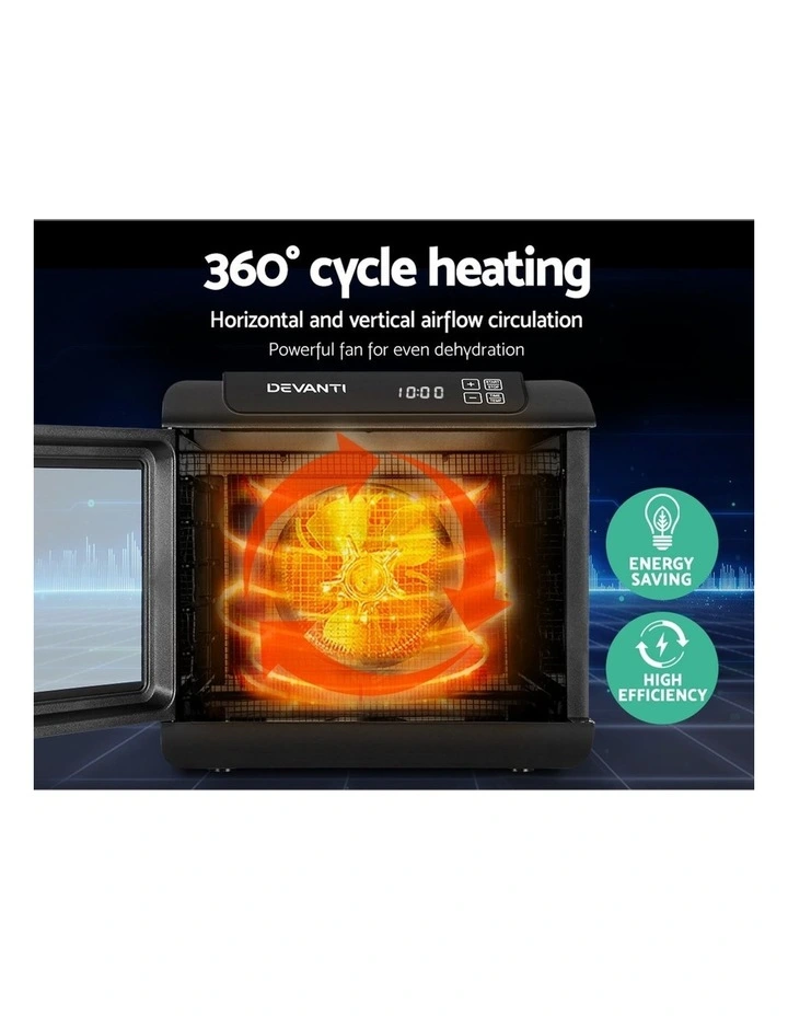 If you love healthy snacks or need to follow a diet plan, our Devanti Food Dehydrator is a must-have. Dehydrated foods have a longer shelf life and retain the same amount of vitamins and minerals as do their fresh counterparts. And our food dehydrator will set you up to enjoy all these delectable goodness by creating your very own great tasting health foods. With its six food-grade stainless steel food trays, our food dehydrator features a complete drying system with all the necessary controls to effectively dry vegetables, fruits, herbs, meat and more. You can easily adjust the temperature and timer to suit the various drying heat and period to suit your dehydration items with easy settings on the LCD touch control panel. Plus, the flame retardant door is transparent for easy monitoring. And when it is done, cleaning the removable trays is as simple as letting the dishwasher do all the work. Not least, the food dehydrator has overheating protection to ensure safe use and comes with a SAA-certified plug.