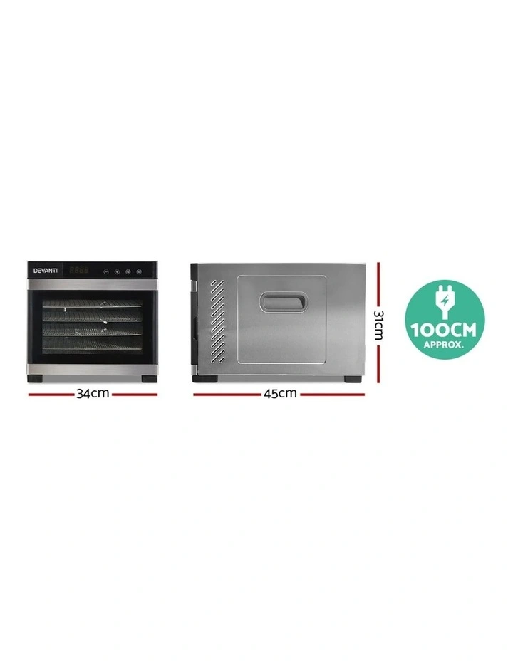 If you love healthy snacks or need to follow a diet plan, our Devanti 6-tray Food Dehydrator is a must-have. Dehydrated foods have a longer shelf life and retain the same amount of vitamins and minerals as do their fresh counterparts. Even more so, with richer and more concentrated flavours. And our food dehydrator will set you up to enjoy all these delectable goodness by creating your very own great tasting health foods. Made with a stainless steel body and genuine food-grade 304 stainless steel trays, our food dehydrator features a smart and simple LCD touch control to effectively dry vegetables, fruits, herbs, meat and more. The flame retardant transparent door prevents heat loss and also helps you to monitor the drying process. Besides enjoying the health benefits of eating non-preservative and natural snacks, you also save time and money by creating your own nibbles for any occasion.