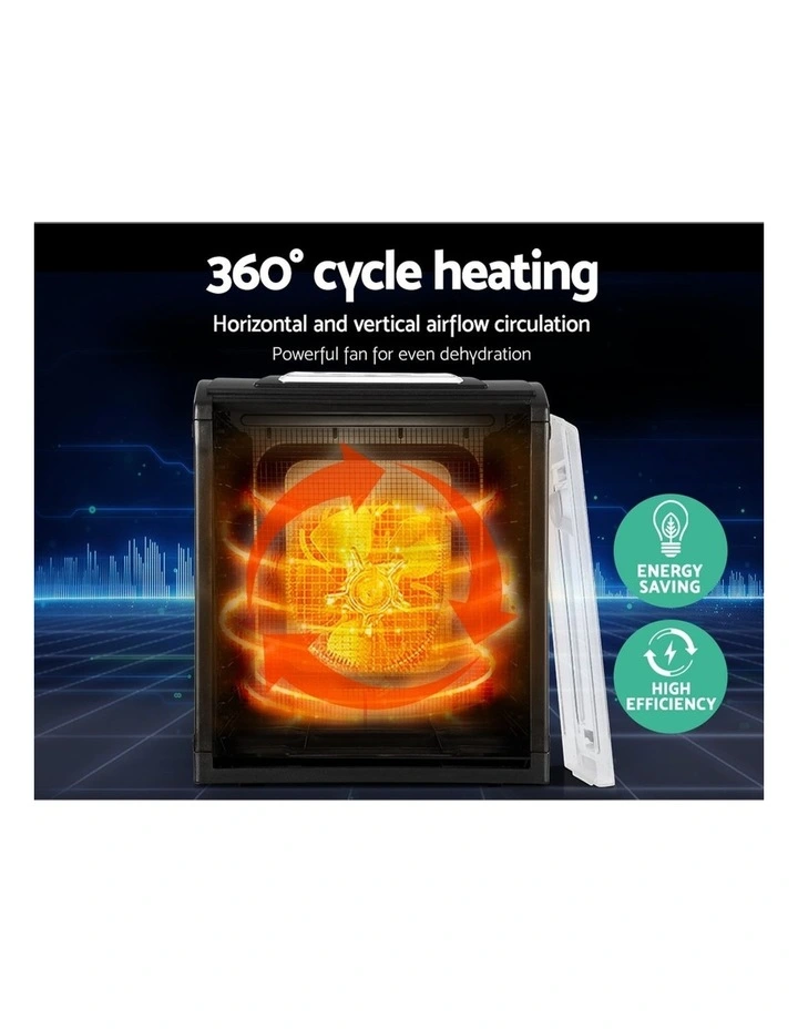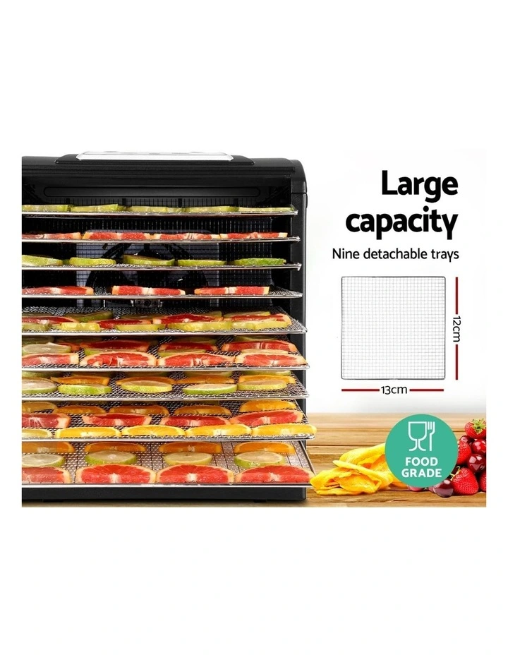 If you love healthy snacks or need to follow a diet plan, our Devanti Food Dehydrator is a must-have. Dehydrated foods have a longer shelf life and retain the same amount of vitamins and minerals as do their fresh counterparts. And our food dehydrator will set you up to enjoy all these delectable goodness by creating your very own great tasting health foods. With its nine food-grade stainless steel food trays, our food dehydrator features a complete drying system with all the necessary controls to effectively dry vegetables, fruits, herbs, meat and more. You can easily adjust the temperature and timer to suit the various drying heat and period to suit your dehydration items with easy settings on the LCD touchpad control panel. Plus, the flame retardant door is transparent for easy monitoring. And when it is done, cleaning the removable trays is as simple as letting the dishwasher do all the work. Not least, the food dehydrator has overheating protection to ensure safe use and comes with a SAA-certified plug.