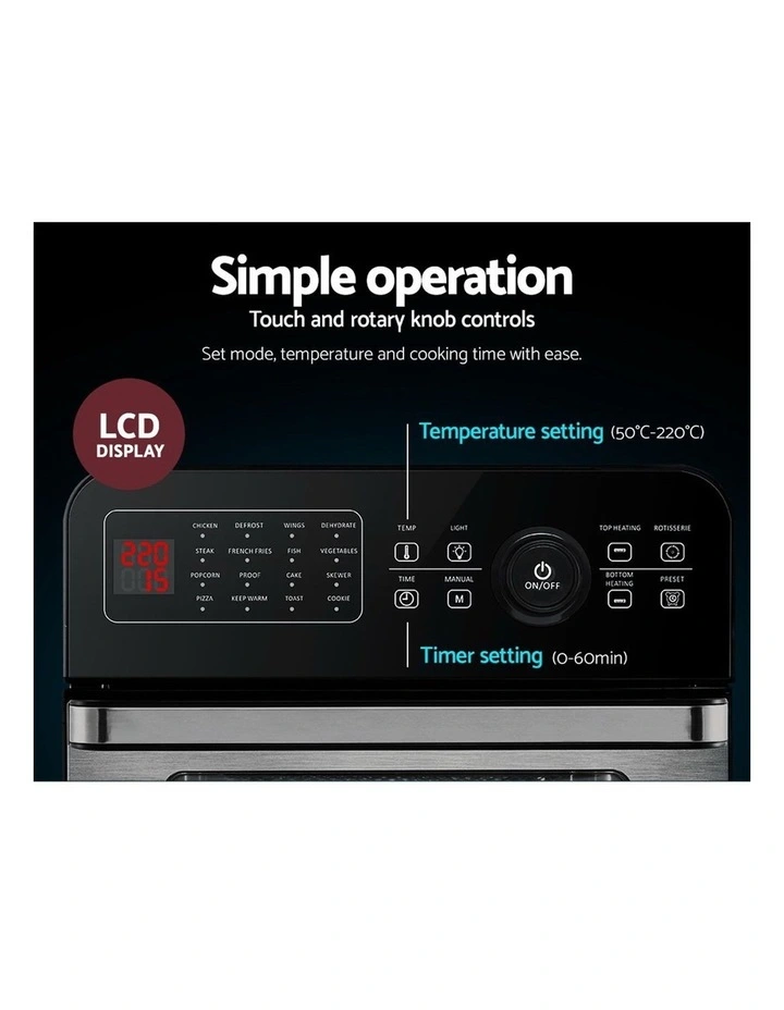 With its stunning stainless steel design, our Devanti Air Fryer turns the ordinary into the extraordinary. And that goes too for its exceptional cooking abilities. With its innovative air frying technology and 1700W of power, your cooking is done efficiently and thoroughly with less odours. Better still, all the wonderful cooking is done without a single drop of oil and yet is as delicious and sumptuous as traditional methods. In fact, foods cooked in our air fryer have up to 80% less fat than deep-fried foods. This model has an all-in-one design and does not only fry food, but also roasts, grills, bakes, broils, toasts, dehydrates, reheats and keeps warm. Just set in the mode (with 16 pre-set programs), time and temperature using the easy-to-use LCD display with touch and rotary knob controls, then leave all the hard work to the air fryer. And monitoring the cooking process is a cinch with the tempered glass viewing window and built-in light. The air fryer has a large 18L capacity making it suitable for a big family; and comes with bonus rolling cage, rotisserie fork, mesh basket, cage tong, wire rack and drip tray to aid you in your cooking. Most importantly, the components are dishwasher-safe, which makes the cleaning up process as easy as the cooking process.