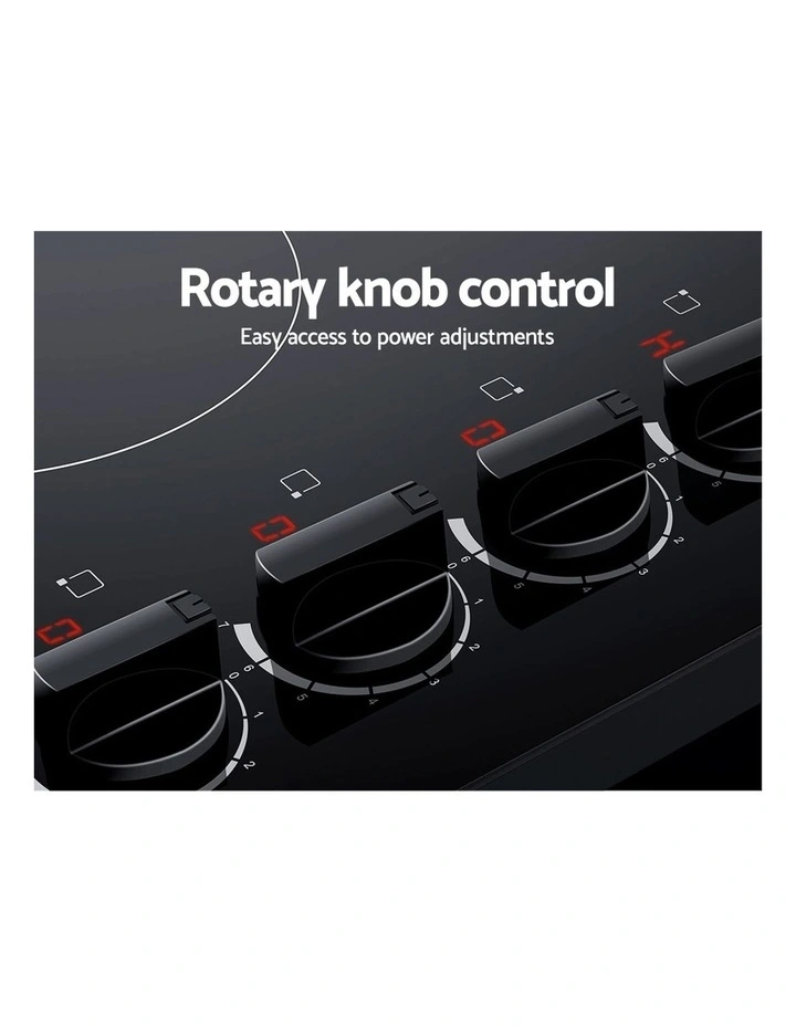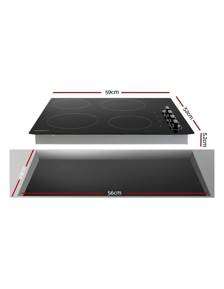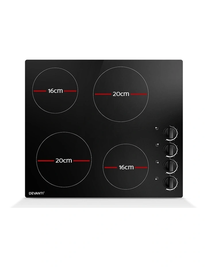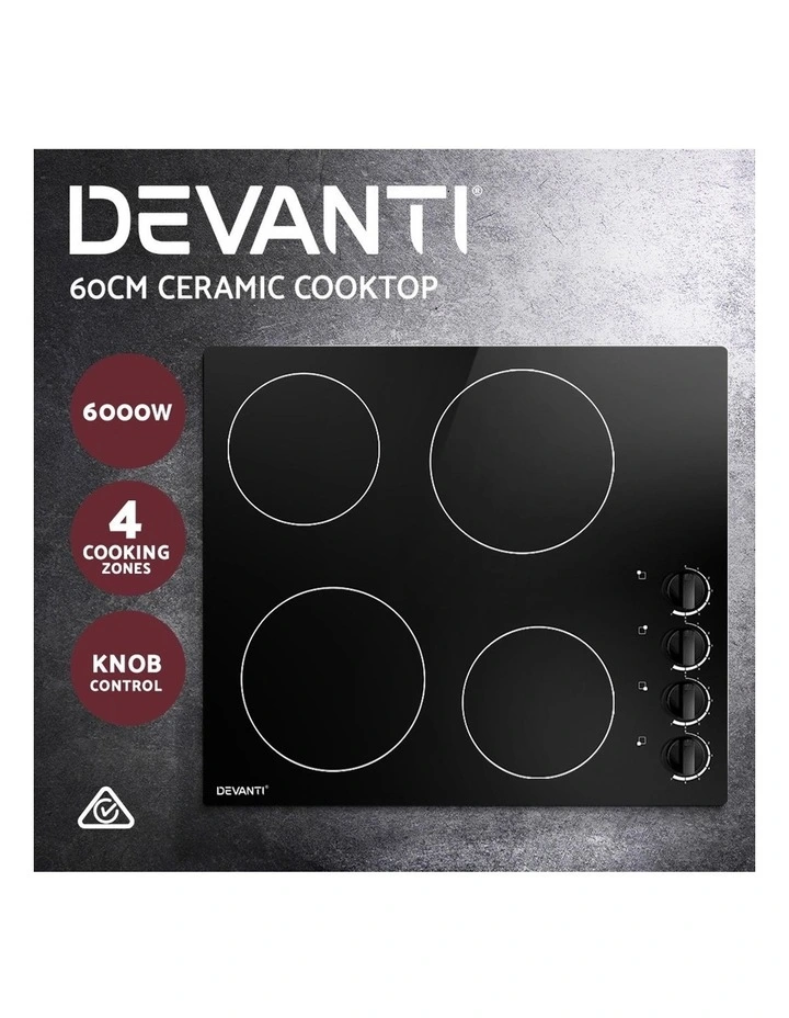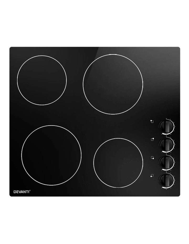 Whether it is for your existing or new home, our Devanti 60cm Ceramic Cooktop is just the right thing you need for easy, no-fuss cooking. Loaded with an extensive list of chef-friendly features such as high wattage cooking zones, easy-to-use 8-step electronically controlled knob regulators and LED display panel, overheat protection and efficient heat dissipation, the cooktop is also incredibly sleek with its high-grade black ceramic plate. It features four cooking zones with seven power levels to choose from to prepare that perfect dish. Plus, the residual heat indicator also helps to tell when it is safe to touch the cooktop after turning the hot plates off. Better still, the cooktop will turn itself off when temperatures get excessively high or you simply forgot to turn it off after your cooking. Powerful and yet integrally safe, the cooktop promises many moments of hassle-free delicious cooking with the right blend of sophistication and class for your kitchen.