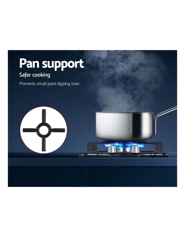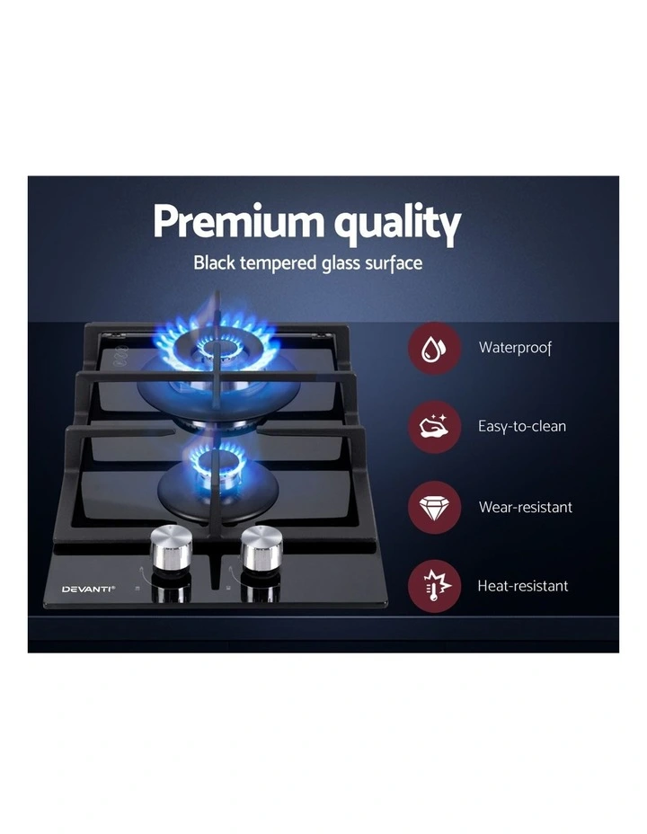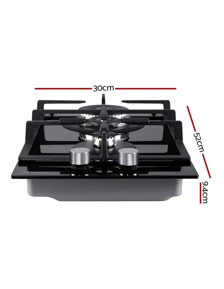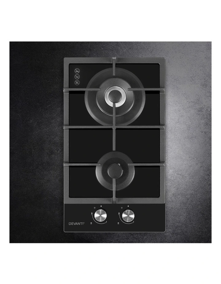 Whether it is for your existing or new home, our Devanti 30cm Gas Cooktop is just the right thing you need for easy, no-fuss cooking. Loaded with an extensive list of chef-friendly features such as an easy ignition system, easy-to-use power-coated knob control with a safety lock and flame failure safety device, the cooktop is also incredibly sleek with its black tempered glass surface. It features two burners, a wok burner and one auxiliary burner, with various power levels to choose from to prepare that perfect dish. The solid cast iron grates hold up your pots and pans perfectly steady and are longlasting and heat-resistant as well. And a pan support is included for use with the auxiliary burner to prevent tiny pans from tipping over and messing up your cooktop. The cooktop is factory set for natural gas but is compatible with LPG once the included LPG conversion kit is installed. Powerful and yet integrally safe, the cooktop promises many moments of hassle-free delicious cooking with the right blend of sophistication and class for your kitchen.