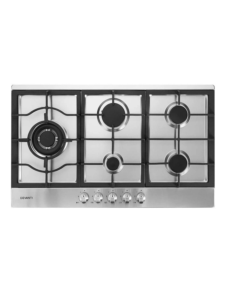 Whether it is for your existing or new home, our Devanti 90cm Gas Cooktop is just the right thing you need for easy, no-fuss cooking. Loaded with an extensive list of chef-friendly features such as an easy ignition system, easy-to-use stainless steel knob controls with safety lock and a flame failure safety device, the cooktop is also incredibly sleek with its stainless steel surface. It features five burners including two semi-rapid burners, one rapid burner, one wok burner and one auxiliary burner, all with various power levels to choose from to prepare that perfect dish. The solid cast iron grates hold up your pots and pans perfectly steady and are longlasting and heat-resistant as well. And a pan support is included for use with the auxiliary burner to prevent tiny pans from tipping over and messing up your cooktop. The cooktop is factory set for natural gas but is compatible with LPG once the included LPG conversion kit is installed. Powerful and yet integrally safe, the cooktop promises many moments of hassle-free delicious cooking with the right blend of sophistication and class for your kitchen.