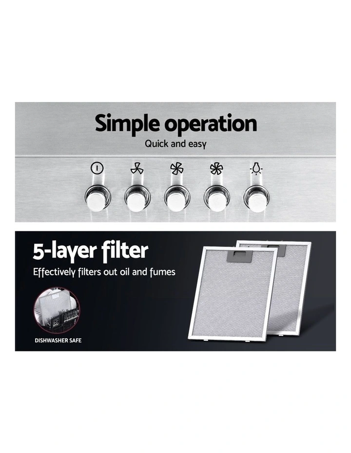 Say goodbye to smoky fumes and unwelcome cooking odours with the Devanti Range Hood. With its high-performance motors, the brushed stainless steel range hood provides a steady upflow and filtered extraction of fumes and oil to keep your cooktop area clean and fresh after every use. With its 3-speed rocker button switches, the extraction speed can be adjusted to suit the circumstances. Other features include two non-stick 5-layer aluminium filters that are removable and replaceable and bright LED lighting to facilitate your illuminated cooking. The range hood is wall mounted and the chimney can be adjusted to fit the installation space.