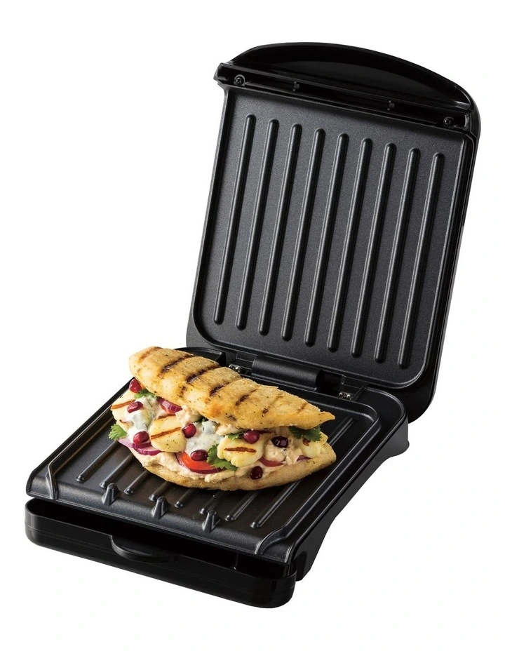 Features: Easy to clean non-stick plates; Fixed plates for fast grilling & heat-up; Sloped design removes up to 42% of fat into drip tray that clips into place; Vertical storage option saves you 25% of space; Floating hinge for grilling thicker foods.