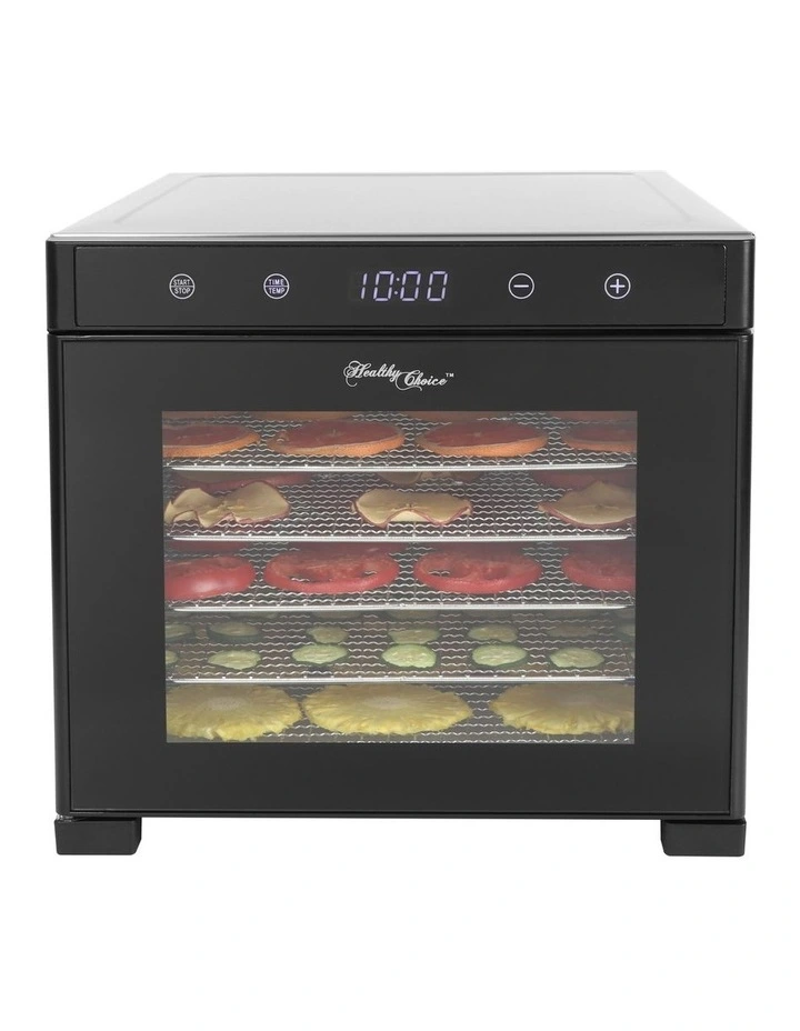 With an adjustable thermostat range of 35C 75C, accounting for different drying temps for a variety of foods, the perfect snack is on its way in a few hours. The drying system eliminates tray rotation, while ensuring the heated air is circulated through all compartments for consistent, even drying across all six tray levels.