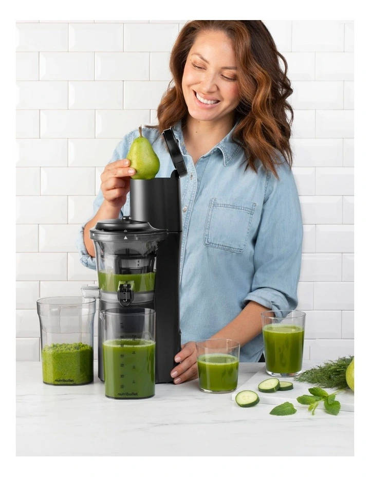 Dontlet its compact size fool you, the NutriBullet SlowJuicer is equipped from top to bottom to handle major juicing. Its wide 3 feedchute fits larger quantities of produce, while its high-torque, low-speed motorand durable steel-tipped auger wring every drop of deep nutrition from yourfavorite fruits and veggies. It also features a no-drip spout that keeps yourjuice mixing until youre ready to fill your glass. Addedbonus? Its low and slow approach is veryquiet something the non-juicing members of your household are sure toappreciate.ย